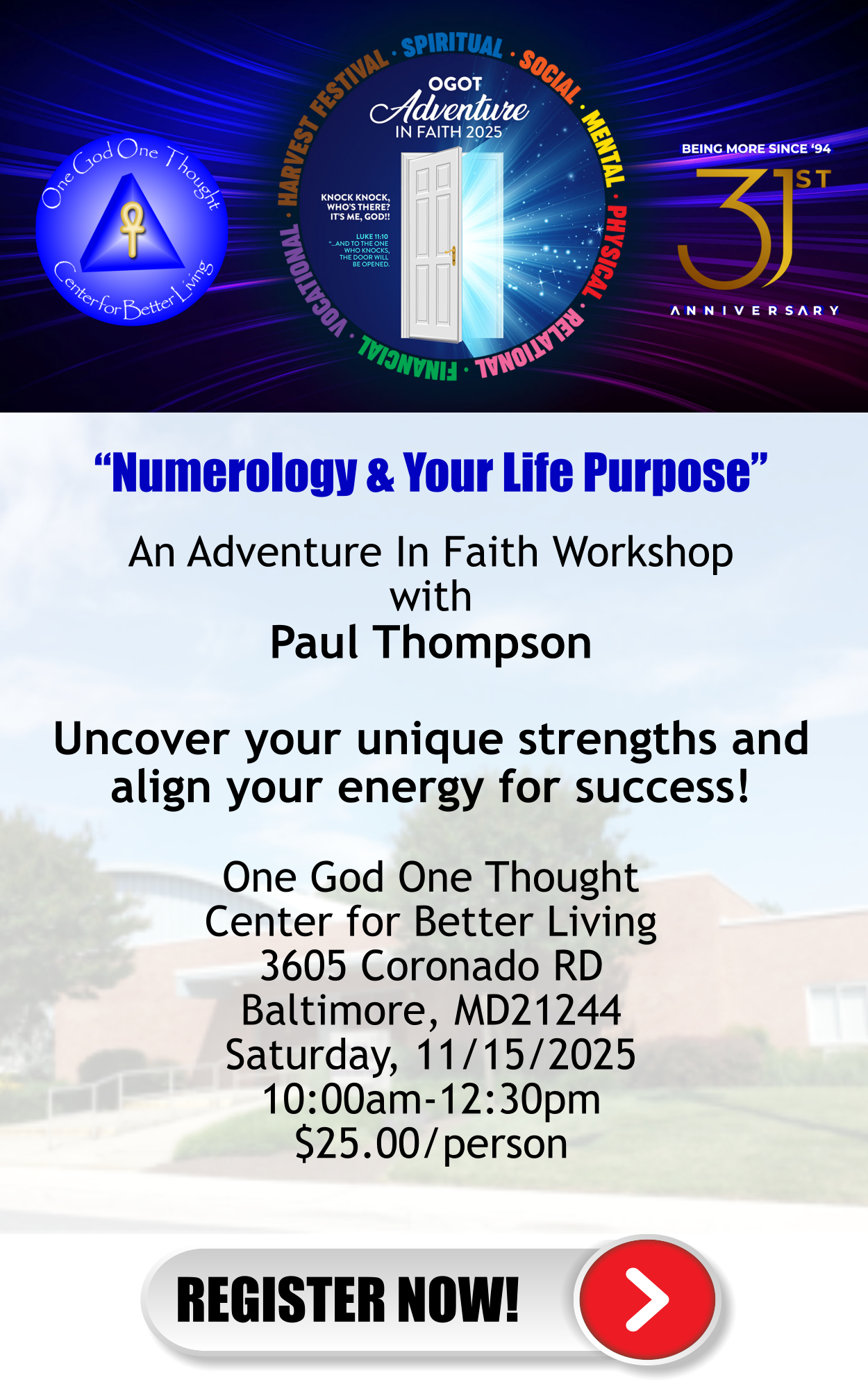 The One God One Thought Center for Better Living, Inc. (OGOT) is a New Thought Christian teaching/learning Spiritual Community where people learn Christian metaphysics and how to practice and apply Spiritual principles in day to day life for healthy, happy, peaceful and prosperous living.